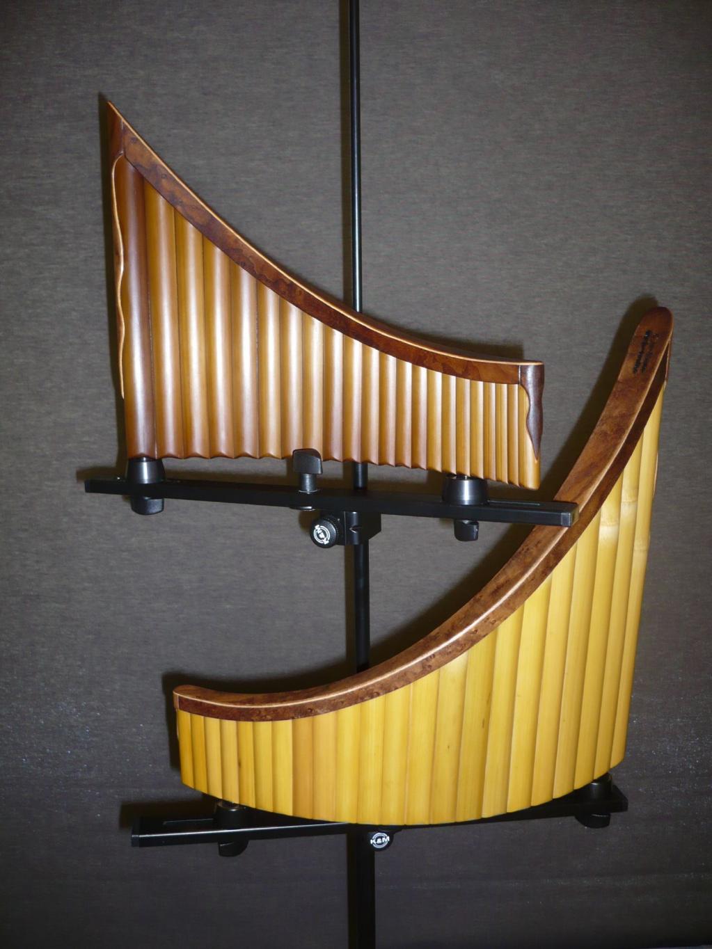 Eine praktische Errungenschaft ist hierfür ein Panflötenhalter. Mittlerweile gibt es ein sehr praktisches Modell, das an den Notenständer geschraubt werden kann. Die zwei Aufnahmezapfen können an fast jede Panflöte angepasst werden. Die oberflächenschonende Gummieinlage verhindert jegliches Zerkratzen.